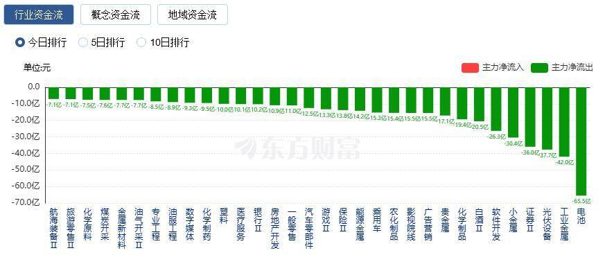 净流出方面,电池、工业金属、光伏设备等净流出排名靠前,其中电池净流出65.53亿元。