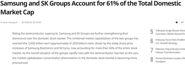 【CNMO科技消息】近日,据韩媒报道,受益于半导体行业的超级周期,三星集团和SK集团在韩国股市的主导地位进一步强化。截至2月26日,这两大集团的合计市值已突破2600万亿韩元,占韩国股市总市值的比重首次超过60%,达到61.29%。