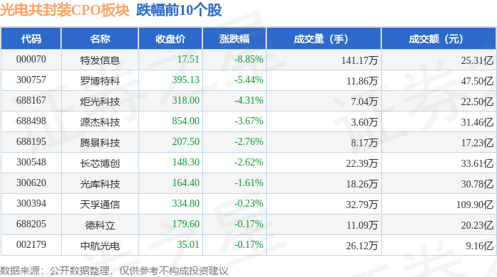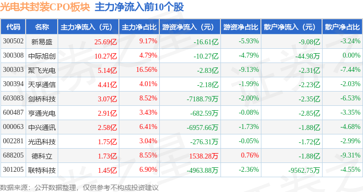 从资金流向上来看,当日光电共封装CPO板块主力资金净流入51.64亿元,游资资金净流出29.98亿元,散户资金净流出21.66亿元。光电共封装CPO板块个股资金流向见下表: