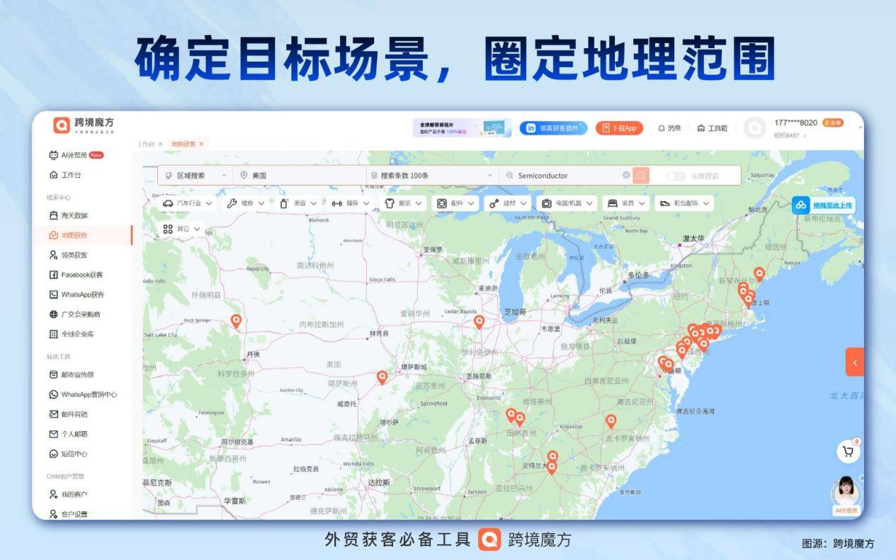 1. 确定目标场景,圈定地理范围:企业登录跨境魔方系统,进入地图获客模块,选择区域搜索,选定目标国家或地区,设置搜索条数,搜索栏下方有关键词分类,可以直接点击关键词进行查找。例如企业想要开拓美国市场,可先选择美国,然后通过关键词搜索Semiconductor,地图上就会显示所有相关企业。