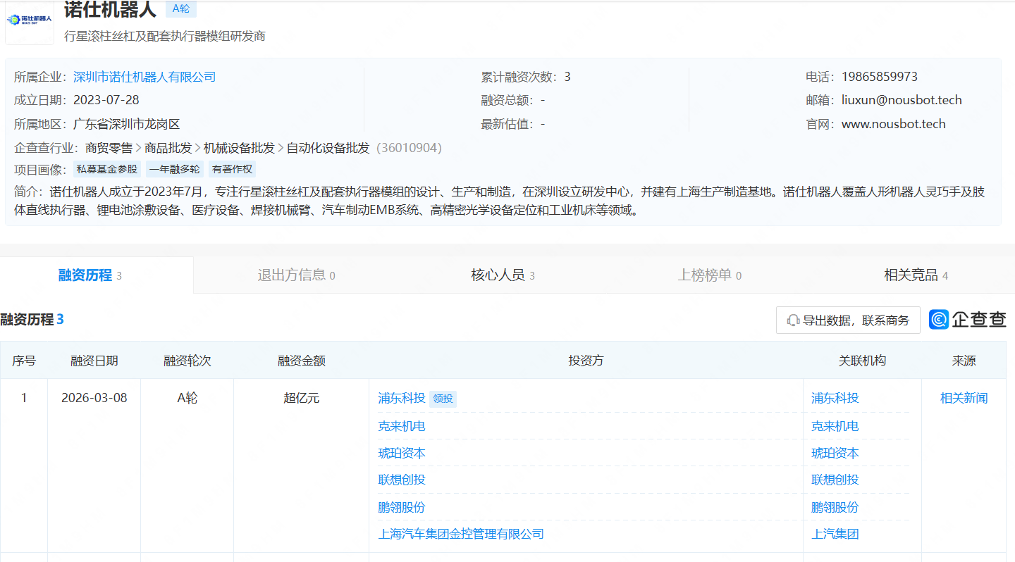 投资界3月9日消息,诺仕机器人(NOUSBOT)近日完成超亿元人民币A轮融资。本轮融资由上海半导体产投领投,联想创投、琥珀资本跟投,汽车产业链上市公司克来机电、鹏翎股份战略入股,老股东上汽金控继续加注。资金将用于产能扩张、技术研发迭代及市场拓展。