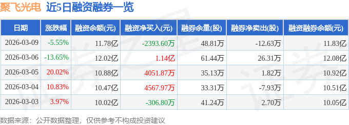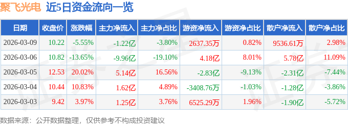 证券之星消息,截至2026年3月9日收盘,聚飞光电(300303)报收于10.22元,下跌5.55%,换手率23.56%,成交量313.17万手,成交额32.01亿元。