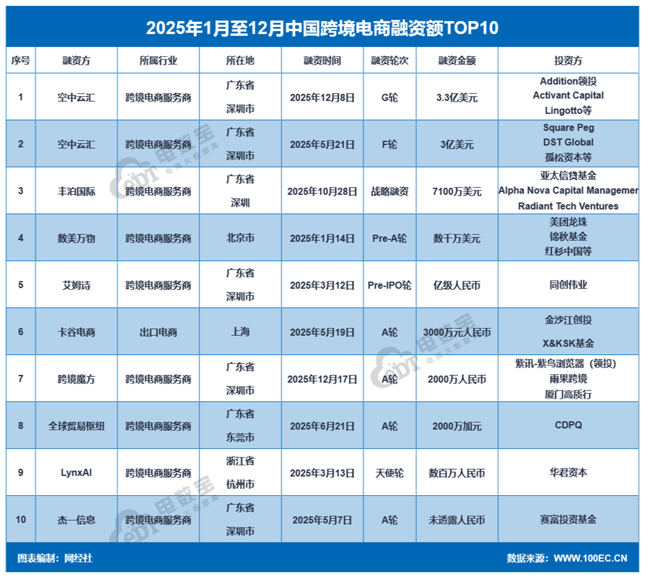 2025年跨境电商融资额TOP10的公司为:空中云汇、丰泊国际、数美万物、艾姆诗、卡谷电商、跨境魔方、全球贸易枢纽、LynxAI、杰一信息。