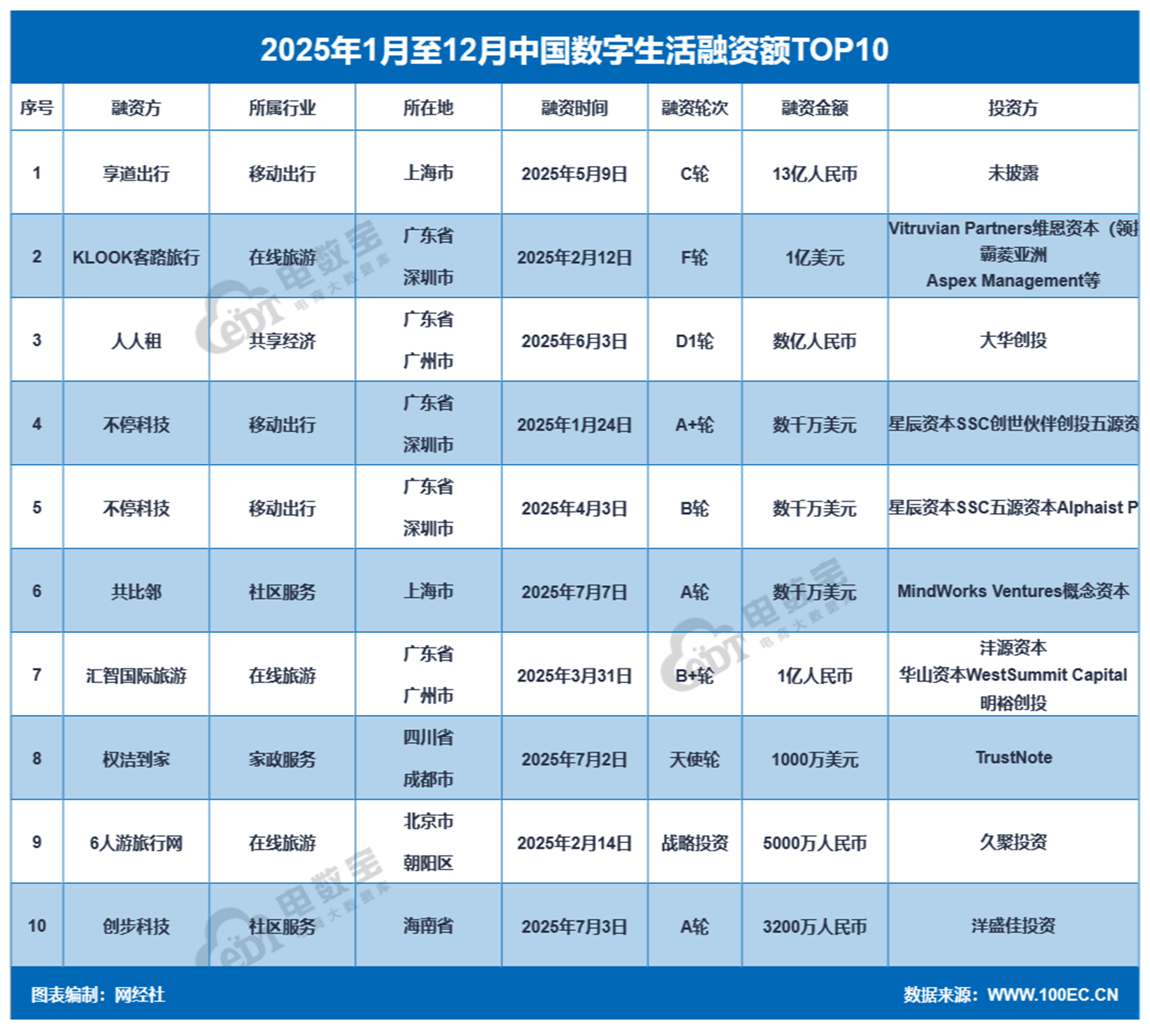 2025年数字生活融资额TOP10的公司为:享道出行、KLOOK客路旅行、人人租、不停科技、共比邻、汇智国际旅游、权洁到家、6人游旅行网、创步科技。