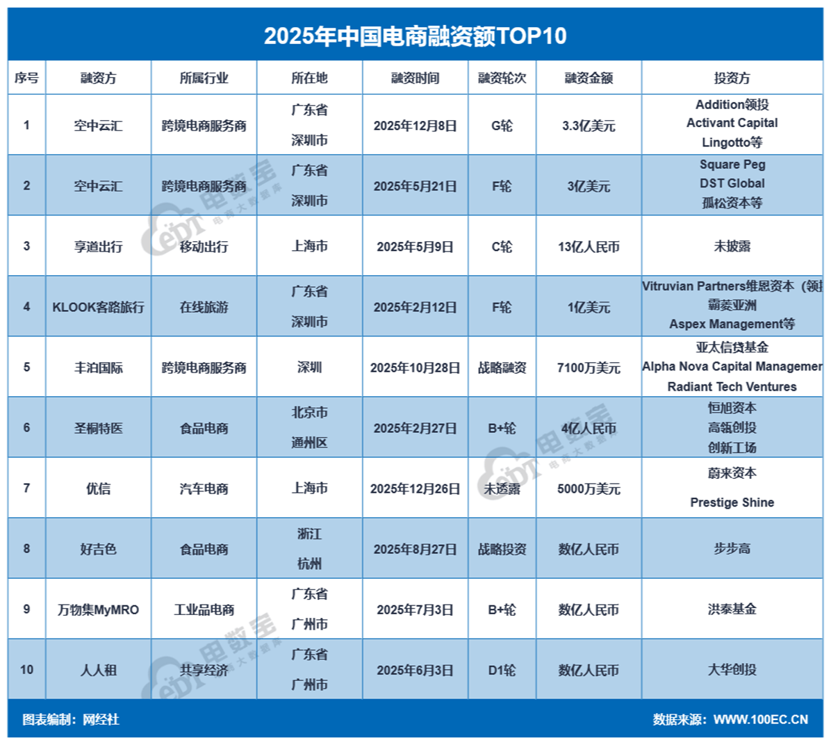 2025年电子商务融资额排名前十的有:空中云汇、享道出行、客路旅行、丰泊国际、圣桐特医、优信、好吉色、万物集MyMRO、人人租,前十总融资金额约81.2亿元,占整体融资金额的71.47%。