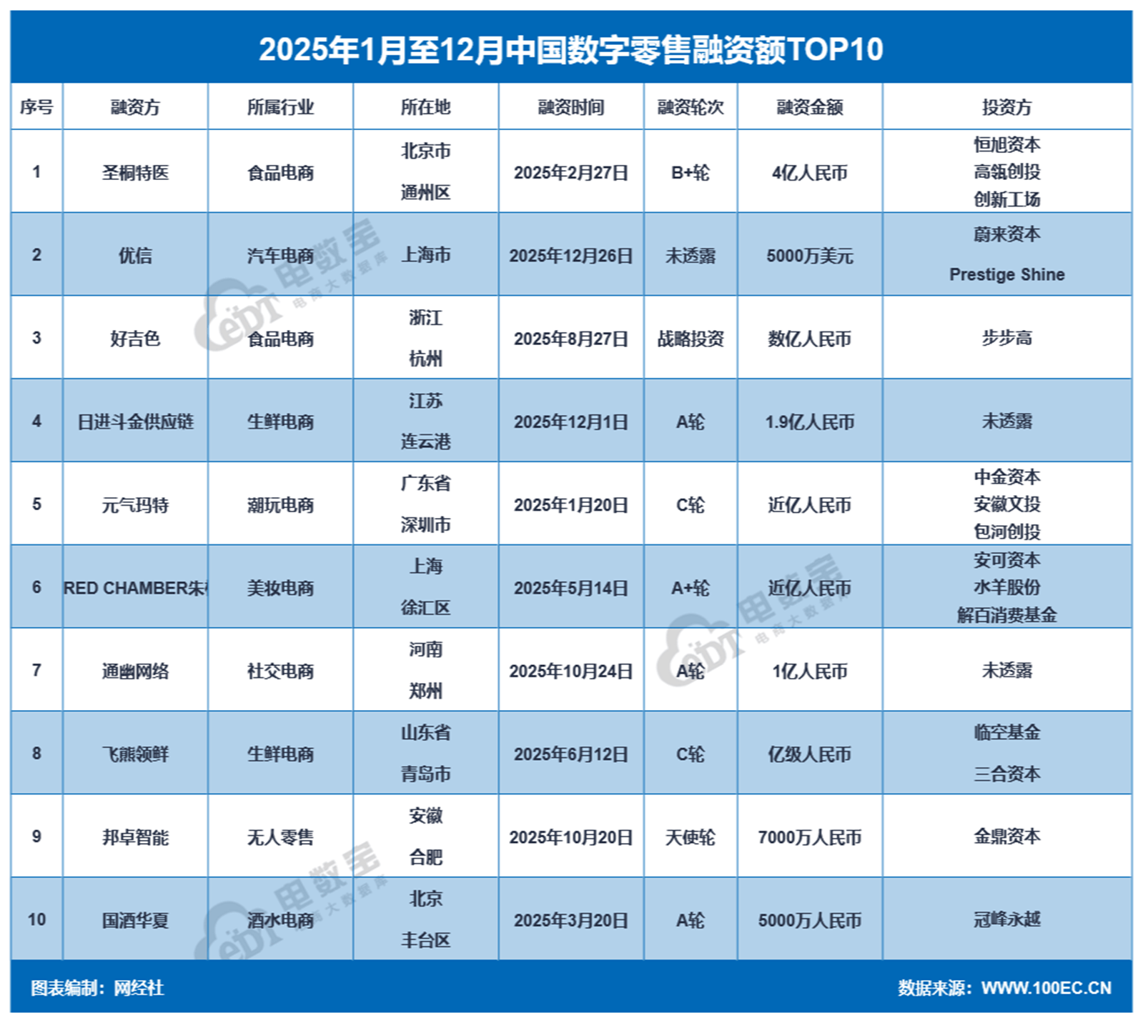 2025年数字零售融资额TOP10的公司为:圣桐特医、优信、好吉色、日进斗金供应链、元气玛特、REDCHAMBER朱栈、通幽网络、飞熊领鲜、邦卓智能、国酒华夏。