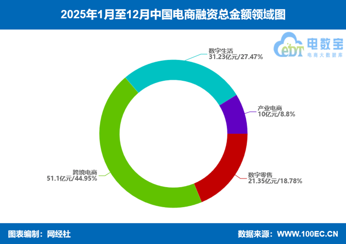 2025年,跨境电商成为资本关注的热门领域。在125起融资中,跨境电商融资11起,融资总额51.1亿元;数字生活30起,融资总额31.5亿元;数字零售69起,融资总额21.35亿元;产业电商15起,融资总额10亿元。