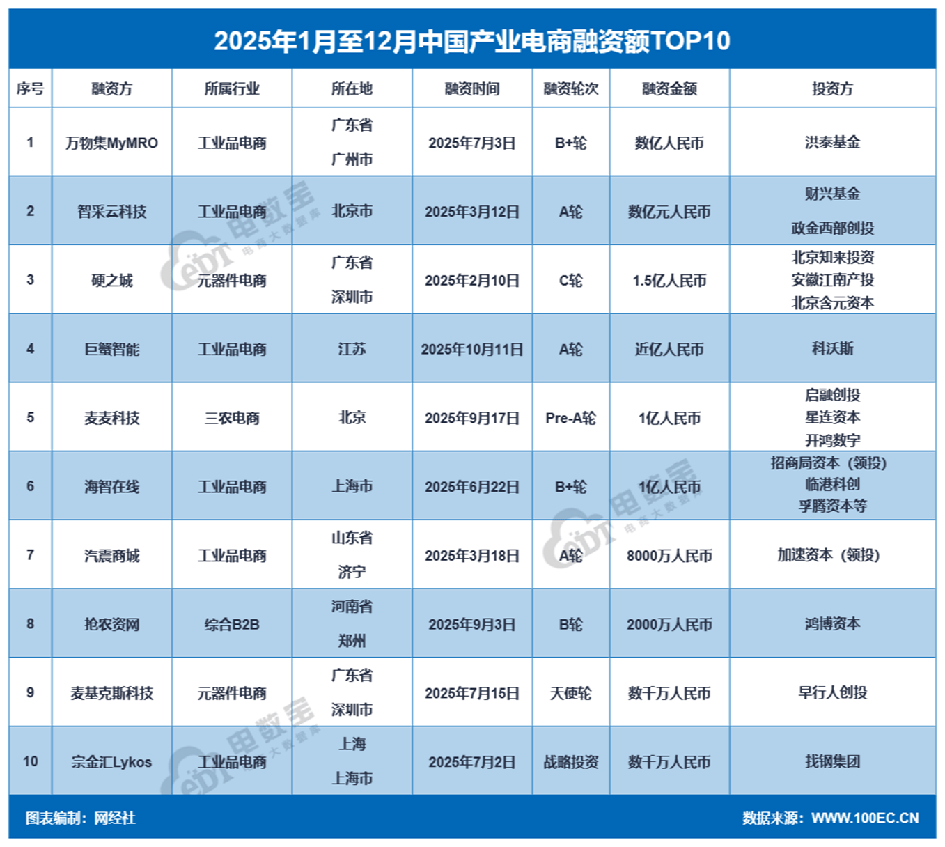 2025年产业电商融资额TOP10的公司为:万物集MyMRO、智采云科技、硬之城、巨蟹智能、麦麦科技、海智在线、汽震商城、抢农资网、麦基克斯科技、宗金汇Lykos。
