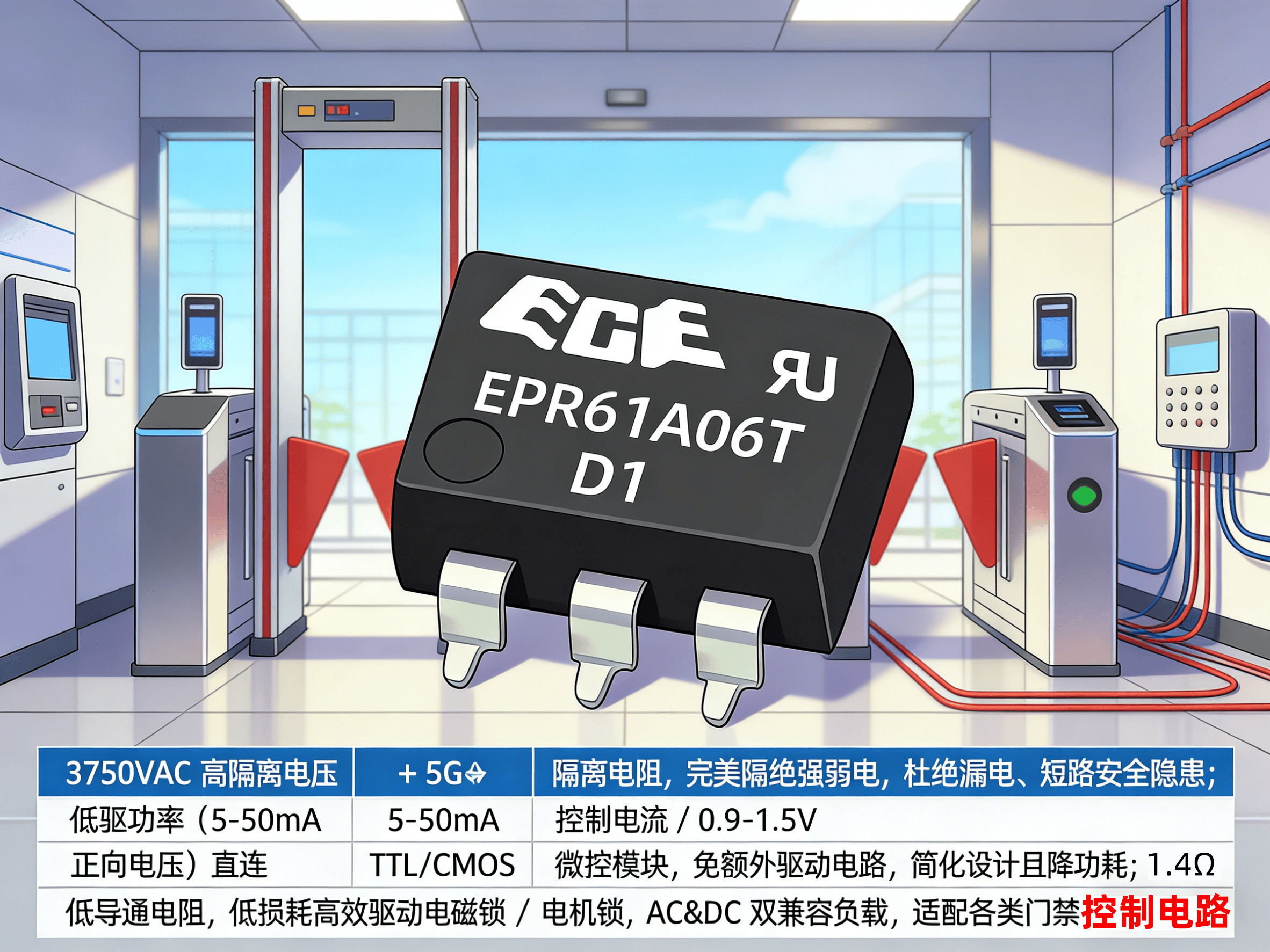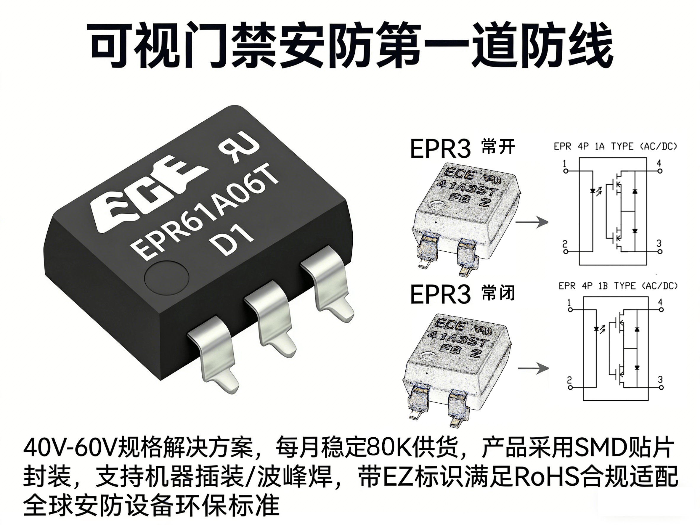 可视门禁作为安防第一道防线,对控制元件的稳定性、抗干扰性要求严苛。EPR 系列光耦继电器直击门禁核心需求,量身打造 40V-60V 规格解决方案,EPR3系列(常开)+EPR3系列(常闭)组合完美匹配通断控制,产品采用 SMD 贴片封装,支持机器插装 / 波峰焊,大幅提升组装效率,且带 EZ 标识满足 RoHS 合规,适配全球安防设备环保标准