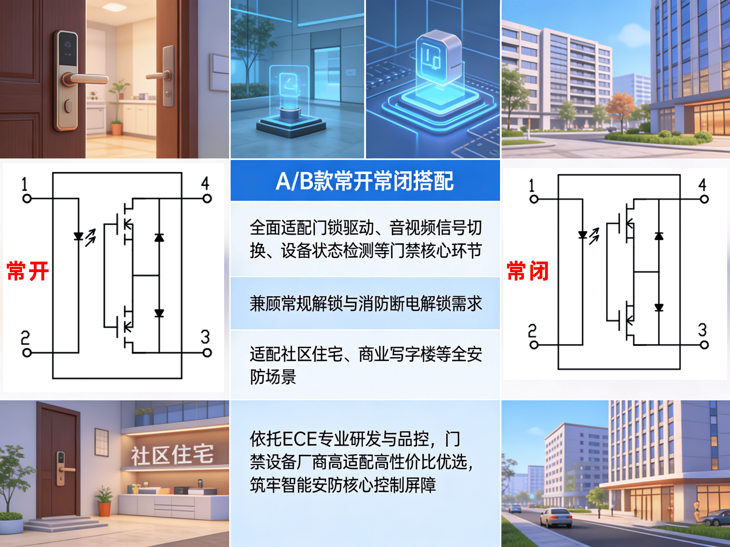 常开常闭组合一站式覆盖门禁全环节控制,可应用于门锁驱动、音视频信号切换、设备状态检测等核心场景,常规解锁与消防断电解锁需求均能满足,适配社区住宅、商业写字楼等全安防场景。依托 ECE 专业的研发与品控实力,这款光耦继电器成为门禁设备厂商的高适配、高性价比优选,为智能安防筑牢核心控制屏障