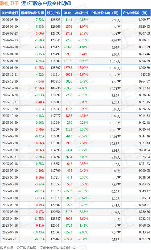 从股价来看,2026年3月10日至2026年3月20日,联创电子区间跌幅为7.52%,在此期间股东户数减少1144.0户,减幅为0.88%。
