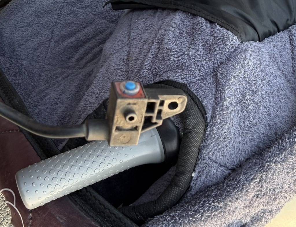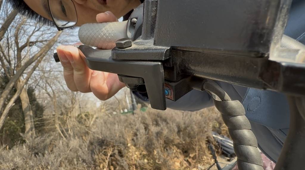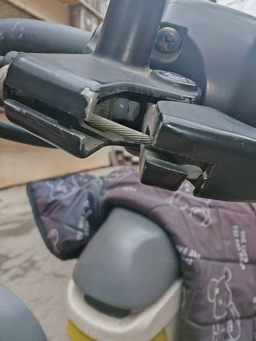 涉事电动车左闸为鼓刹,和右闸上的断电开关不同,鼓刹上的断电开关在不捏闸状态下,是被包裹的。
