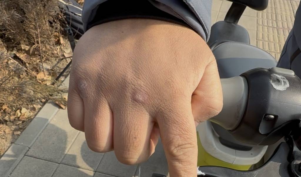 2026年1月30日,曹先生展示右手手背显示,距事发已经两个多月,右手手背两个伤口均留下疤痕。