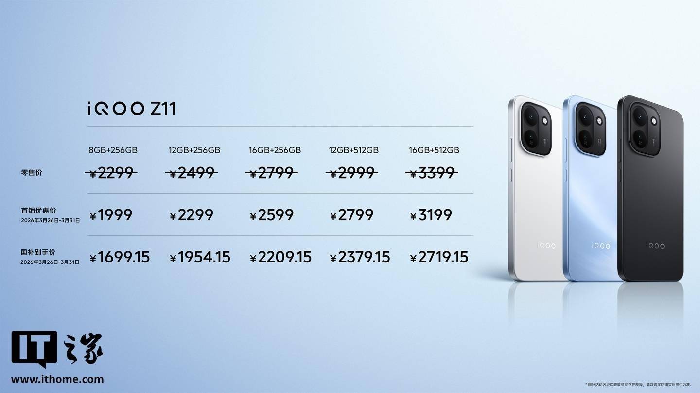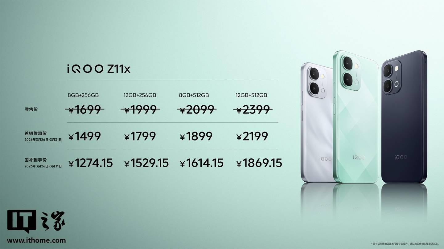 IT之家 3 月 26 日消息,iQOO Z11 系列今晚正式发布并开售,首销 1499 元起。据介绍,Z11 带来两大越级功能双首发:iQOO 手机最大 9020mAh 电池 + iQOO 首个 165Hz 护眼电竞屏;Z11x 配 LCD 莱茵护眼屏 + 7200mAh 蓝海电池。
