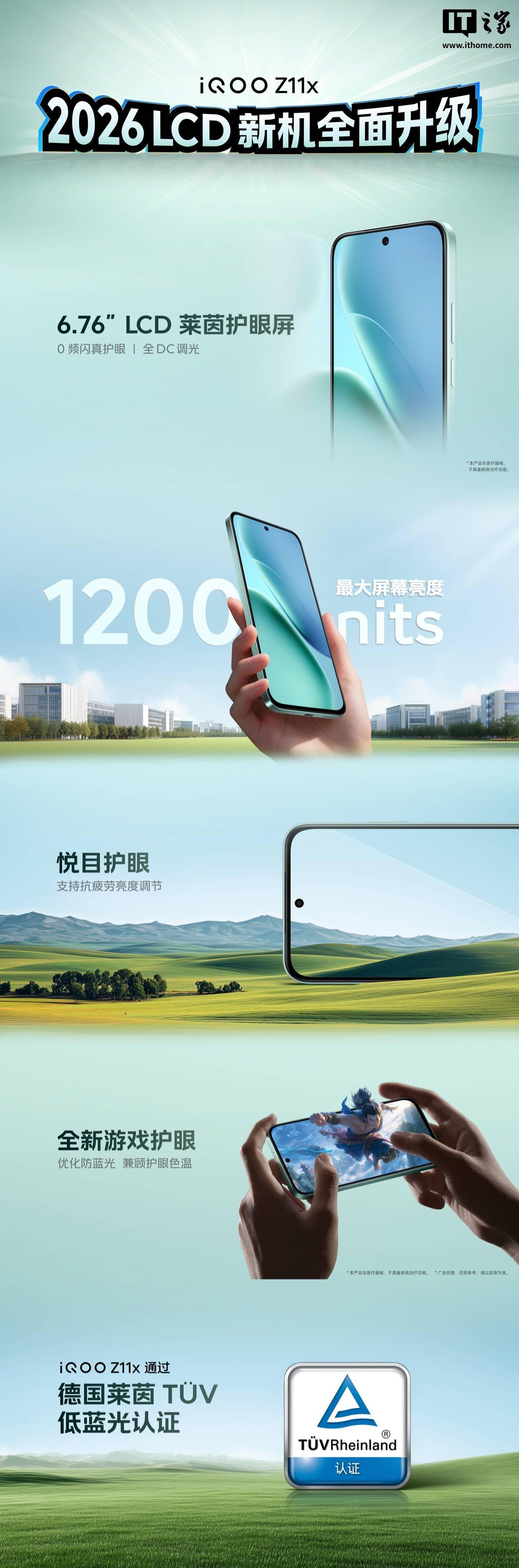 iQOO Z11x 硬件升级 6.76 英寸护眼屏,影音游戏视野更宽广;LCD 屏幕自带 DC 调光,真正 0 频闪,视觉更舒服;最大屏幕亮度达 1200nits,户外看手机画面也清晰。