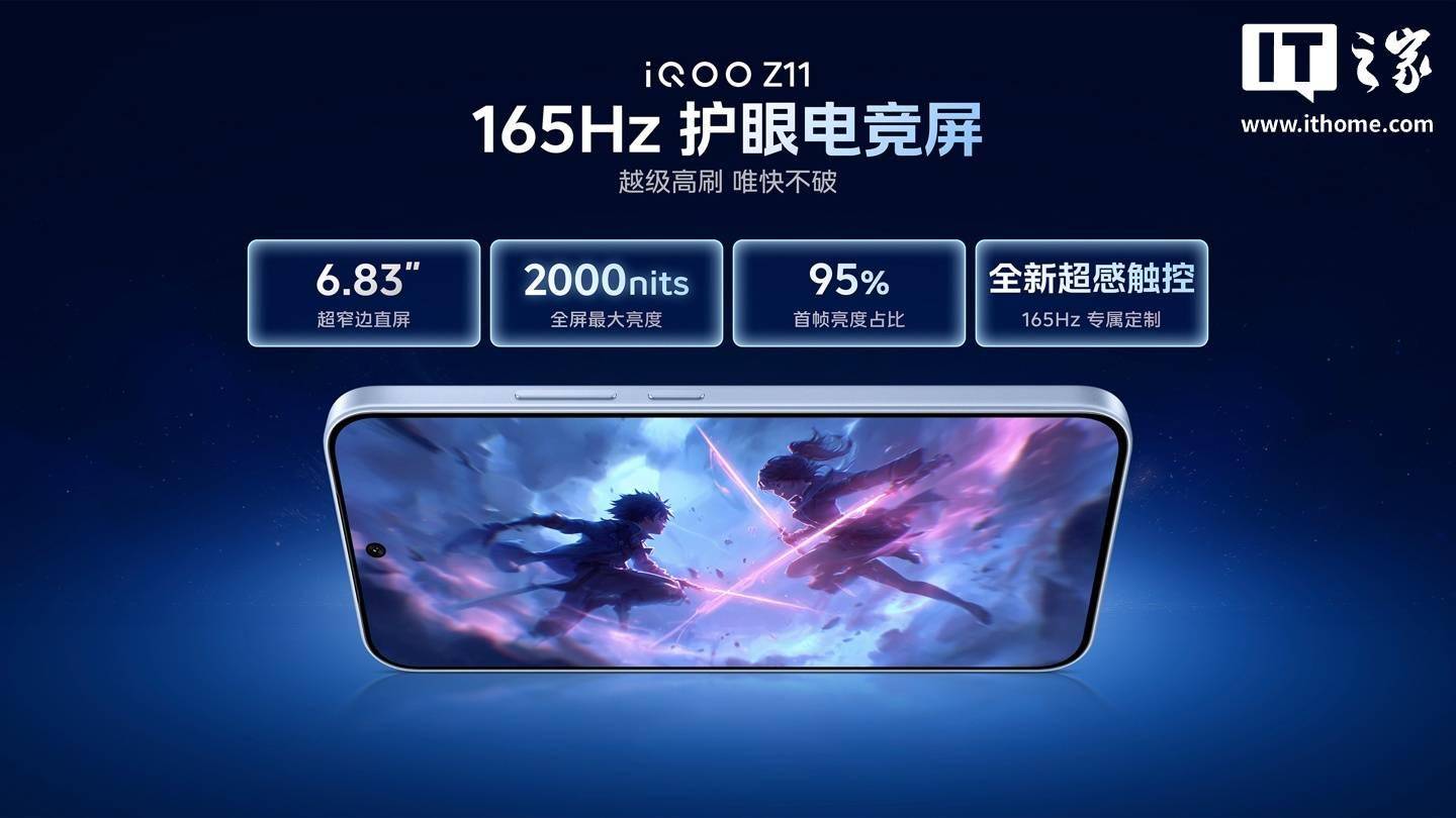 iQOO Z11 手机还搭载 iQOO 首款 165Hz 护眼电竞屏:采用 6.83 英寸超窄边直屏设计,视野更加开阔;全局最大亮度 2000nits,室外更加清晰;支持 95% 首帧亮度占比,干脆利落低拖影;拥有全新超感触控技术,专属优化 165Hz 触控点击及滑动时延。