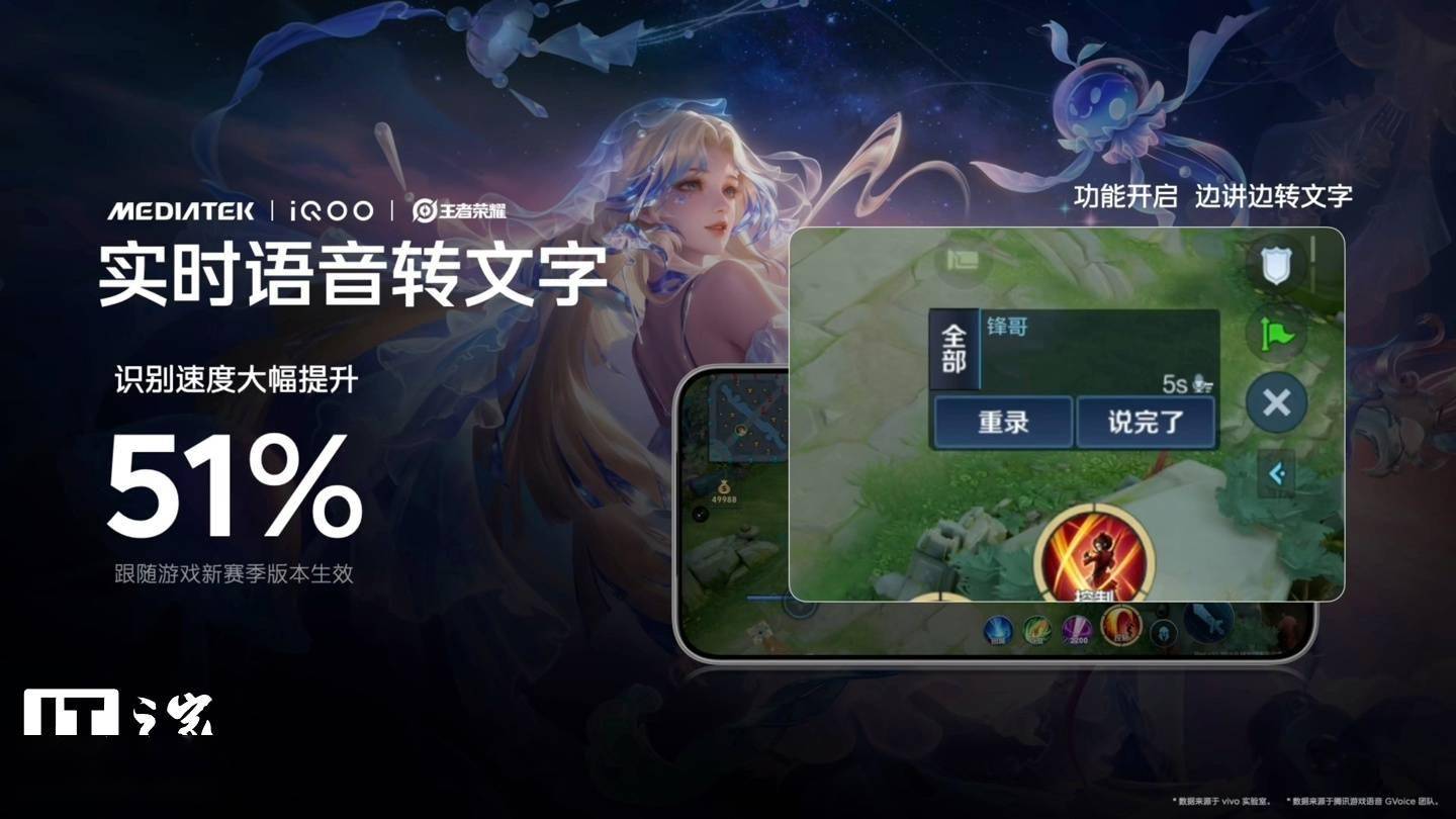 - ③iQOO 携手老朋友《王者荣耀》联合深度优化,充分释放芯片的端侧 AI 算力,识别速度大幅提升 51%;