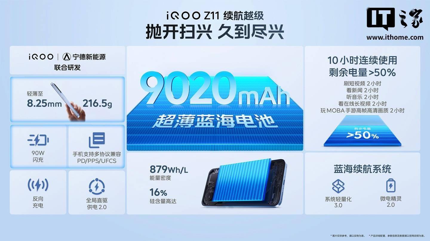 iQOO Z11 搭载 iQOO 手机史上最大的 9020mAh 超薄蓝海电池,采用第四代硅负极和第二代半固态电芯;搭载蓝海续航系统,宣称超 10 小时多场景连续使用剩余电量>50%。