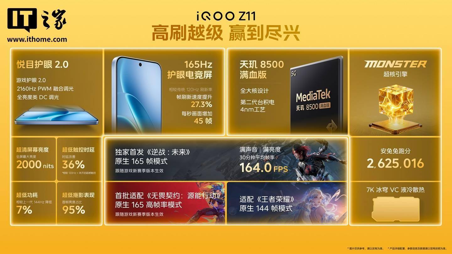 IT之家注意到,iQOO Z11 手机还独家首发《逆战:未来》原生 165 帧、首批适配《无畏契约:源能行动》165 帧模式、支持《王者荣耀》原生 144 帧模式。