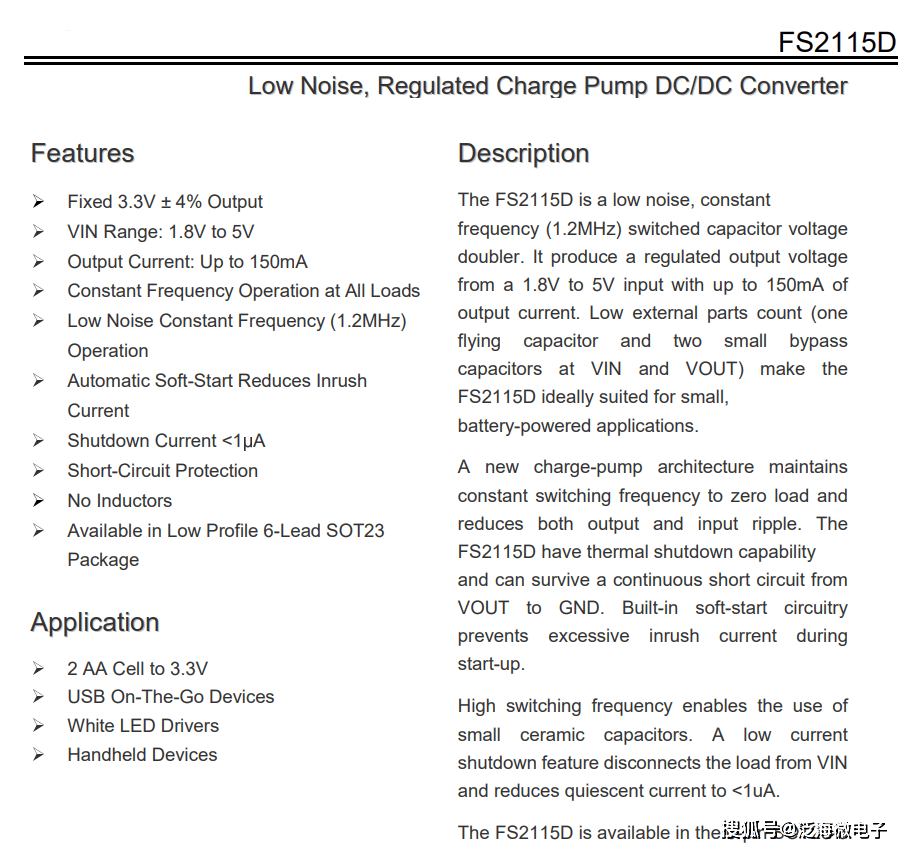 FS2115D 是一款低噪声、恒定频率 (1.2MHz) 开关电容倍压器。它从 1.8V 至 5V 输入产生一个稳定的输出电压,输出电流高达 150mA。FS2115D 的外部元件数量少(VIN 和 VOUT 处有一个跨接电容器和两个小型旁路电容器),非常适合小型电池供电应用。