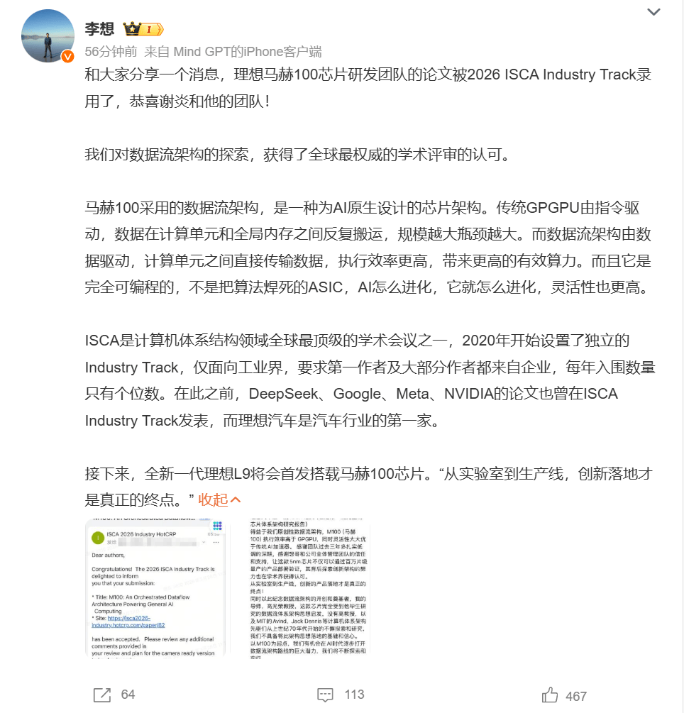 网通社快报 3月30日,理想汽车创始人李想通过个人社交平台发布官方消息,理想汽车马赫100芯片研发团队的技术论文,已被2026年国际计算机体系结构大会(ISCA)IndustryTrack正式录用,理想汽车成为全球汽车行业首家获得该顶级学术会议工业赛道收录的企业。