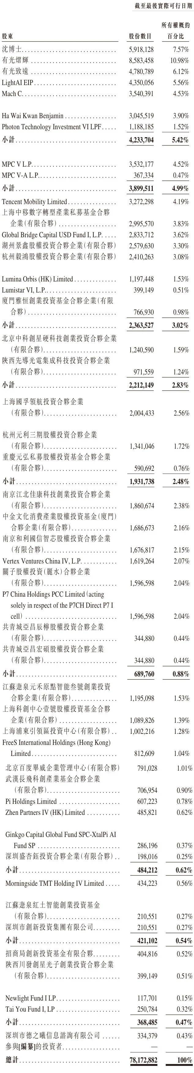 IPO前,沈亦晨博士直接持股为7.57%,有光熠辉持股为10.98%,有光致远持股为6.12%,LightAI EIP持股为5.56%,Mach C持股为4.53%。