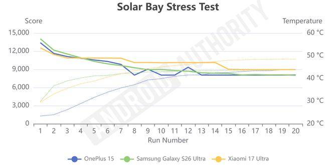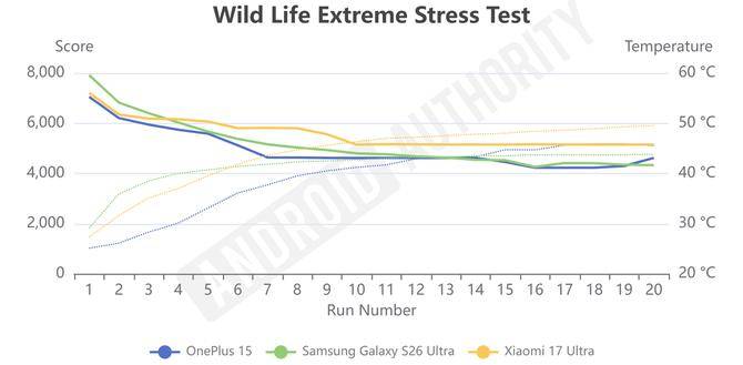 然而这一图形性能优势持续时间较短。三星机型在三款设备中升温速度排名靠前,约 4 分钟后触发系统降频机制,性能表现回归与竞品相近水平。这一测试结果说明,定制芯片在短时爆发场景表现出色,但持续高负载散热管理仍有优化空间。