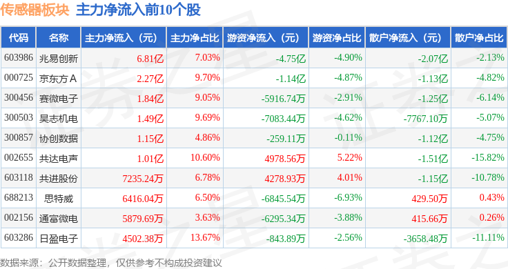 从资金流向上来看,当日传感器板块主力资金净流入6.78亿元,游资资金净流出9.26亿元,散户资金净流入2.48亿元。传感器板块个股资金流向见下表: