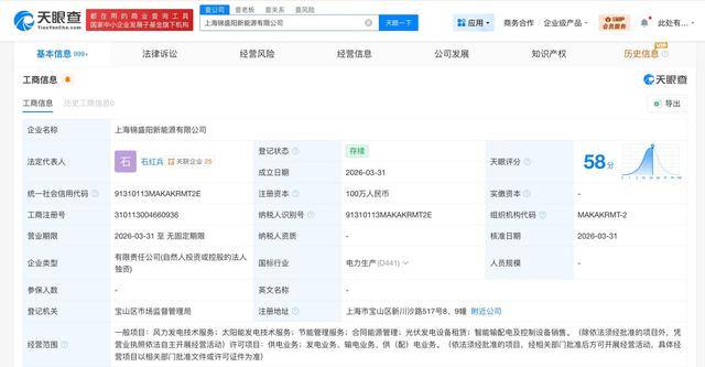 天眼查工商信息显示,近日,上海锦盛阳新能源有限公司成立,法定代表人为石红兵,注册资本100万人民币,经营范围包括风力发电技术服务、太阳能发电技术服务、节能管理服务、合同能源管理、光伏发电设备租赁等。股东信息显示,该公司由阳光电源旗下合肥春阳新能源投资有限公司全资持股。