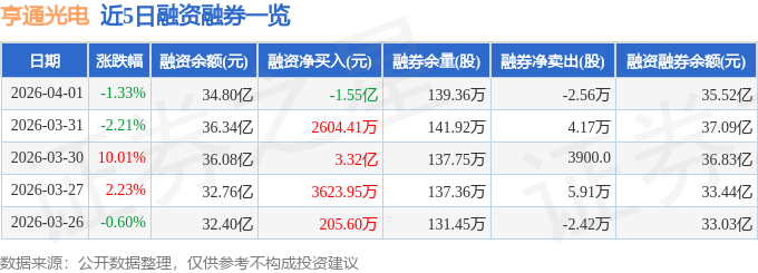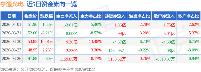 证券之星消息,截至2026年4月1日收盘,亨通光电(600487)报收于51.96元,下跌1.33%,换手率5.27%,成交量128.74万手,成交额66.86亿元。