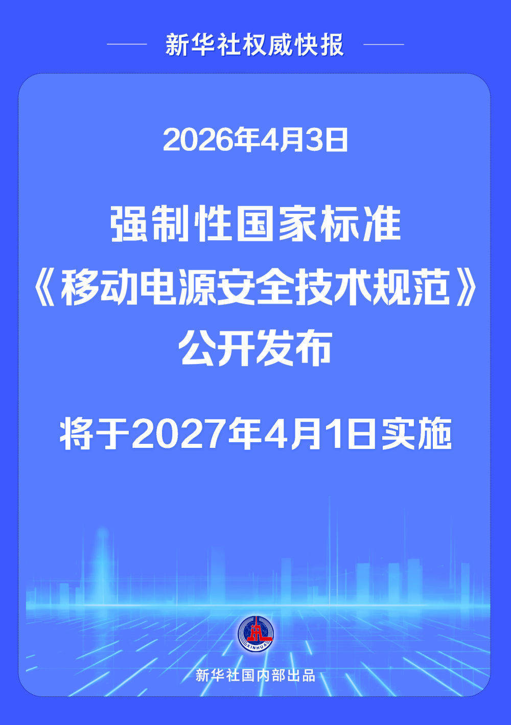 2026年4月3日,强制性国家标准《移动电源安全技术规范》公开发布,将于2027年4月1日实施。新标准提出多项要求,进一步强化包括充电宝在内的移动电源产品安全水平——