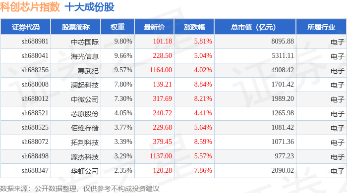 科创芯片(000685)指数十大成份股详情如下: