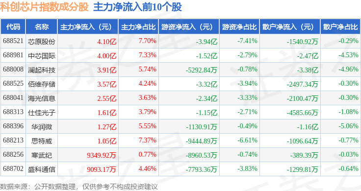 资金流向方面,科创芯片(000685)指数成份股当日主力资金净流入合计27.25亿元,游资资金净流出合计22.91亿元,散户资金净流出合计4.35亿元。成份股资金流向详情见下表:
