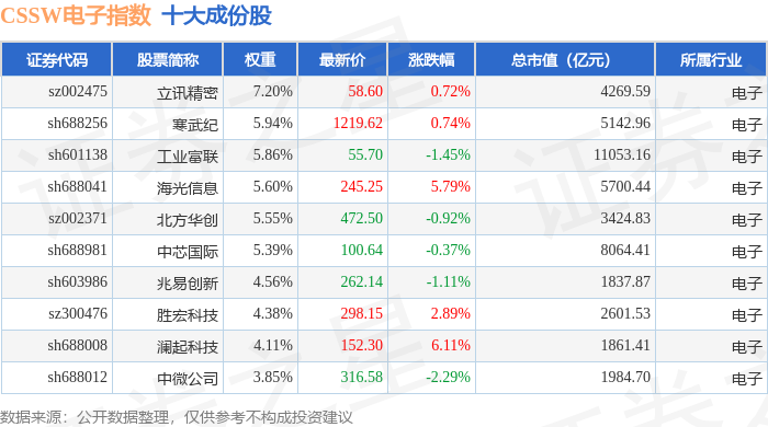证券之星消息,4月13日,CSSW电子(399811)指数报收于593855.0点,涨79.0%,成交1648.97亿元,换手率214.0%。当日该指数成份股中,上涨的有26家,生益电子以11.26%的涨幅领涨,下跌的有33家,燕东微以4.57%的跌幅领跌。