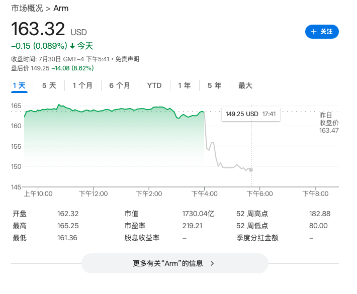 财报公布后,Arm周三盘后大跌超过8.5%。自2023年上市以来,Arm股价已飙升约150%。目前其股价相当于预期收益的80多倍,远高于英伟达、AMD和其他专注于人工智能的芯片制造商的市盈率。