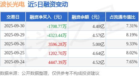 证券之星消息,9月30日,波长光电(301421)融资买入2.42亿元,融资偿还2.59亿元,融资净卖出1708.77万元,融资余额4.4亿元。