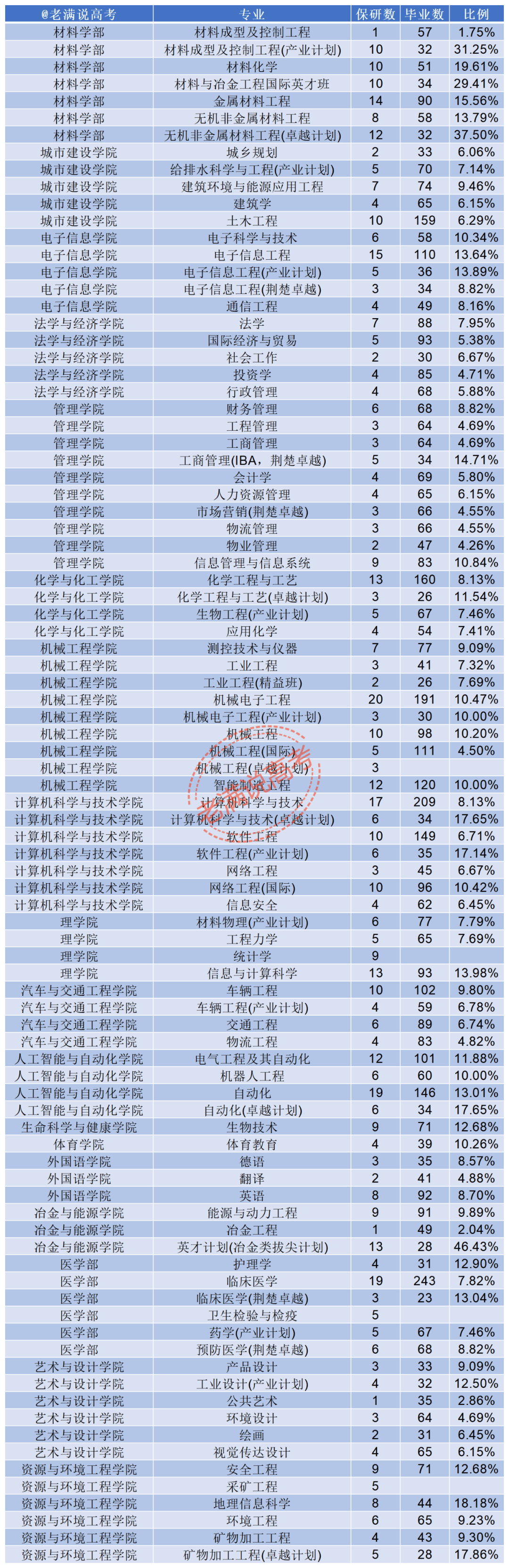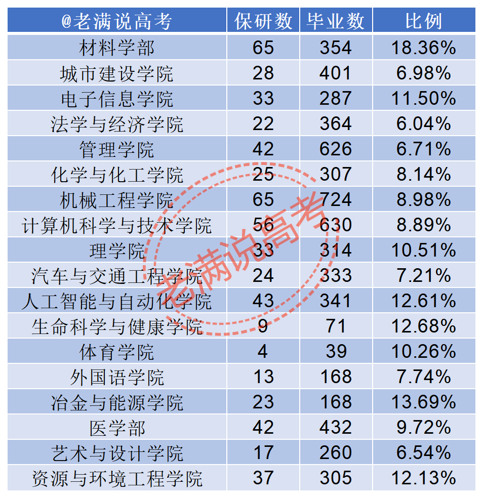 先看一组扎心数据:全校保研率最高的专业是冶金与能源学院的英才计划(冶金工程拔尖计划),46.43%的保研率意味着班里近一半学生能直接保送;而材料学部的材料成型及控制工程(普通班)保研率仅1.75%,57人里只有1个保研名额。这种差距,比高考时"985"和"双非"的录取难度差还要离谱。