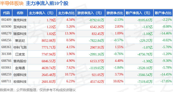 从资金流向上来看,当日半导体板块主力资金净流出215.7亿元,游资资金净流入112.62亿元,散户资金净流入103.08亿元。半导体板块个股资金流向见下表: