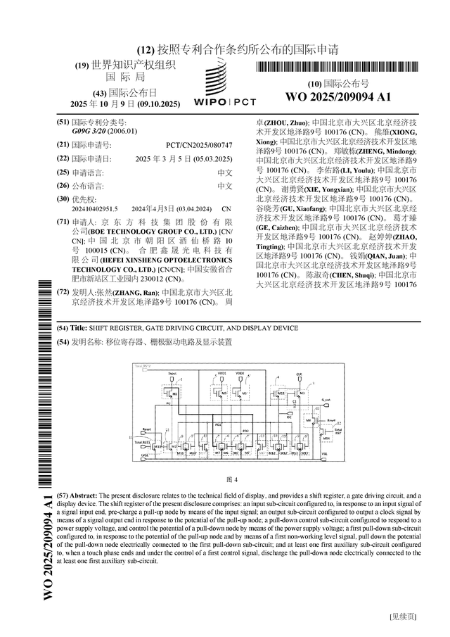 证券之星消息,根据企查查数据显示京东方A(000725)公布了一项国际专利申请,专利名为“移位寄存器、栅极驱动电路及显示装置”,专利申请号为PCT/CN2025/080747,国际公布日为2025年10月9日。
