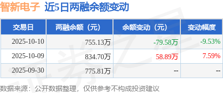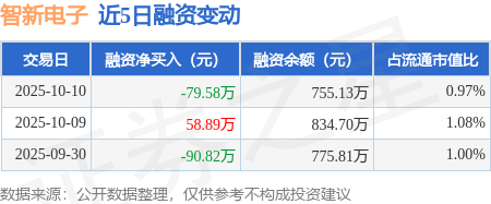 证券之星消息,10月10日,智新电子(920212)融资买入7.9万元,融资偿还87.48万元,融资净卖出79.58万元,融资余额755.13万元。