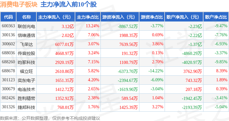 从资金流向上来看,当日消费电子板块主力资金净流出45.2亿元,游资资金净流入6.05亿元,散户资金净流入39.16亿元。消费电子板块个股资金流向见下表: