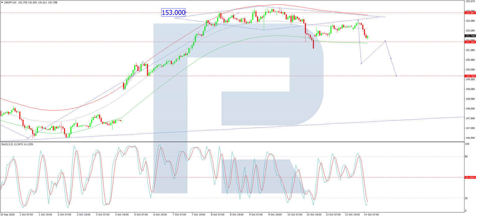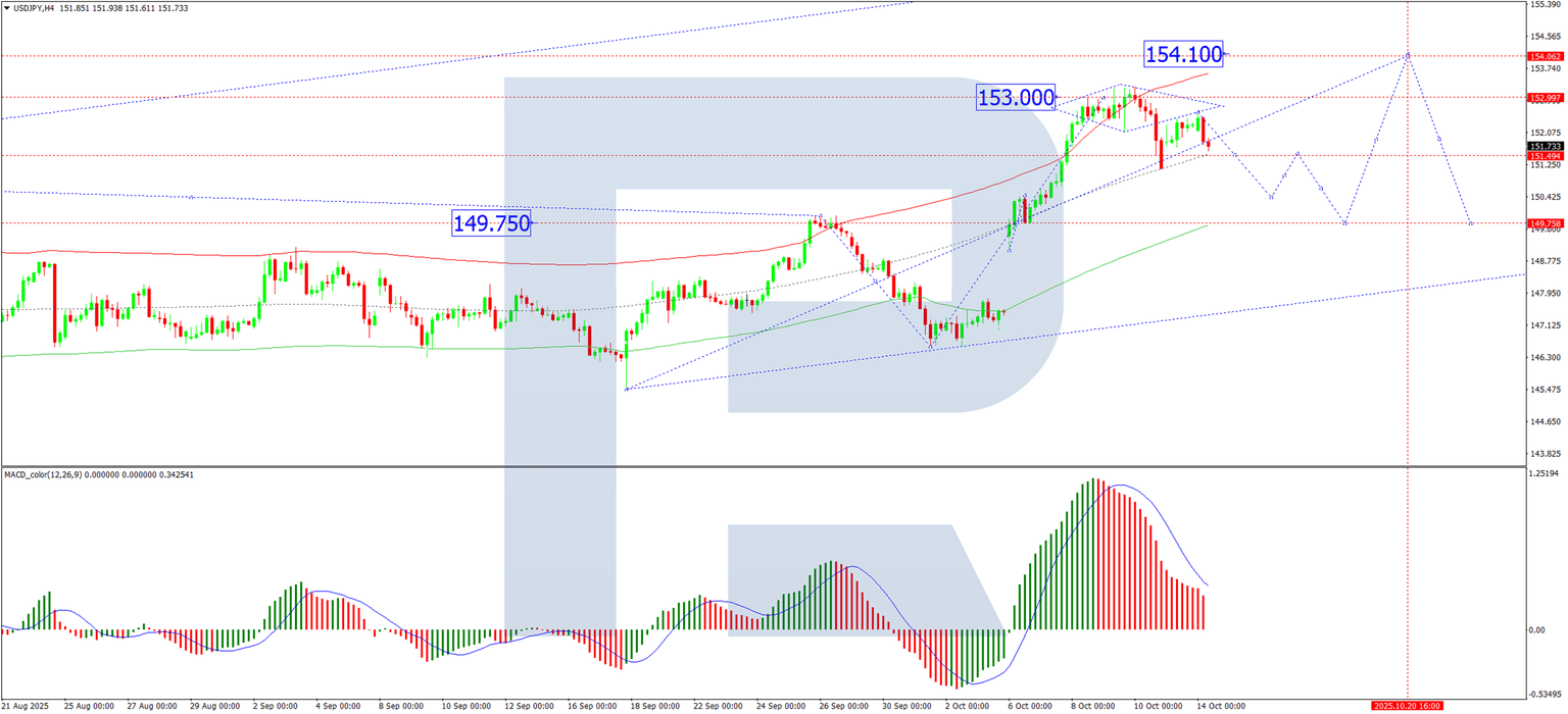 下行波浪结构正在向151.49水平展开。我们预计,一旦触及该目标位,将形成一个窄幅盘整区间。若随后突破该水平,则可能进一步跌至150.40,更广泛的下行趋势可能延伸至149.75。从技术面来看,MACD指标证实了这种看跌情景,其信号线位于零轴上方,但正从高点急剧下行。