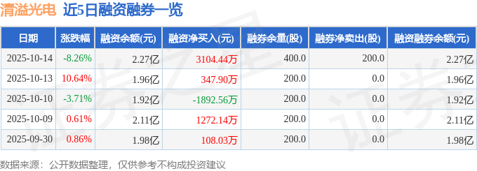 清溢光电融资融券信息显示,融资方面,当日融资买入6642.43万元,融资偿还3537.99万元,融资净买入3104.44万元。融券方面,融券卖出200.0股,融券偿还0.0股,融券余量400.0股,融券余额1.3万元。融资融券余额2.27亿元。