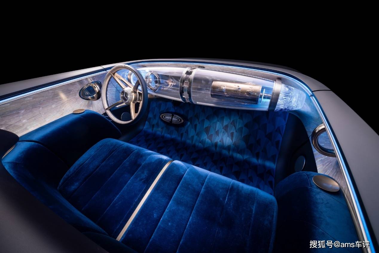 车内装饰采用闪亮的珍珠母镶嵌和抛光黄铜元素,豪华感十足。驾驶员与乘客共坐一张厚实的蓝色丝绒长椅。四辐式方向盘延续复古风格,而地板上的图案再次呼应了扇形装饰艺术(Art Deco)美学。