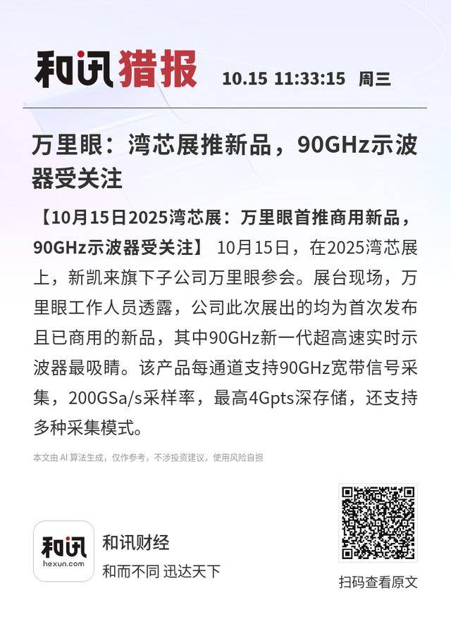 【10月15日2025湾芯展:万里眼首推商用新品,90GHz示波器受关注】10月15日,在2025湾芯展上,新凯来旗下子公司万里眼参会。展台现场,万里眼工作人员透露,公司此次展出的均为首次发布且已商用的新品,其中90GHz新一代超高速实时示波器最吸睛。该产品每通道支持90GHz宽带信号采集,200GSa/s采样率,最高4Gpts深存储,还支持多种采集模式。