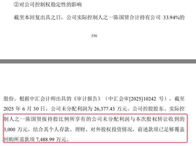 截至2025年6月30日,公司未分配利润为26,377.43万元。公司控股股东、实际控制人之一陈国贤按持股比例所享有的公司未分配利润与本次股权转让收到的3000万元,结合其个人存款、理财、对外股权投资情况,前述款项已足够覆盖回购所需款项7488.99万元。