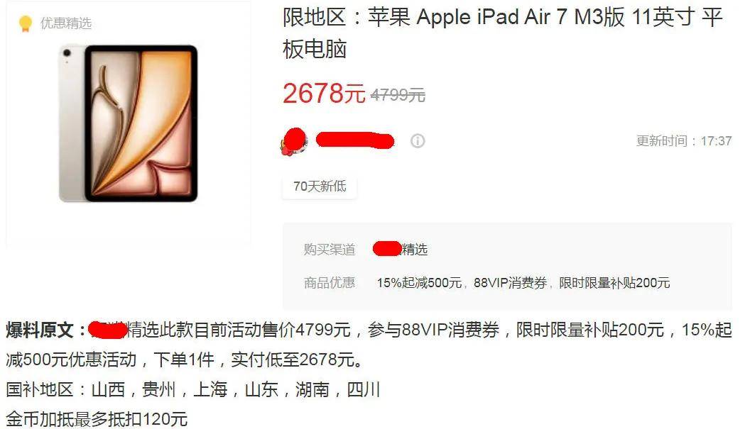 根据张大妈17点37分的爆料,某猫原价4799元的iPad Air7 M3版(11英寸/128G版),通过限时补贴和国家补贴等多重优惠后,实付低至2678元,其中国补地区有山西、贵州、上海、山东、湖南和四川这六大省份,覆盖面较广。