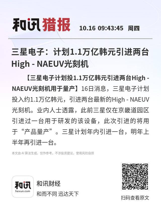 【三星电子计划投1.1万亿韩元引进两台High - NAEUV光刻机用于量产】16日消息,三星电子计划投入约1.1万亿韩元,引进两台最新的High - NAEUV光刻机。业内人士透露,此前三星仅在京畿道园区引进过一台用于研发的该设备,此次引进的将用于“产品量产”。三星计划年内引进一台,明年上半年再引进一台。