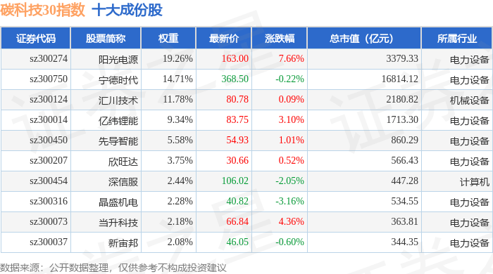 证券之星消息,10月16日,碳科技30(399030)指数报收于4562.36点,涨1.48%,成交740.72亿元,换手率3.85%。当日该指数成份股中,上涨的有12家,阳光电源以7.66%的涨幅领涨,下跌的有18家,金力永磁以5.24%的跌幅领跌。