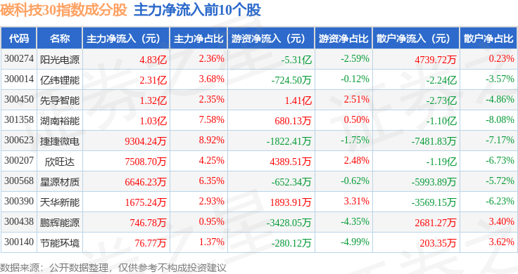 资金流向方面,碳科技30(399030)指数成份股当日主力资金净流出合计13.9亿元,游资资金净流入合计7.12亿元,散户资金净流入合计6.79亿元。成份股资金流向详情见下表: